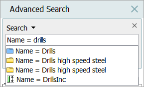 If you enter a text string and click the Search button, search finds objects with an ID, and/or a name and/or an attribute and/or their values matching the entered string. You can further refine standard searches as shown below.