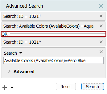 For example, the search shown below returns all objects where the ID starts with the text '1821' and the color is 'Aqua,' plus all objects where the name starts with the text '1821' and the color is 'Aero Blue.'