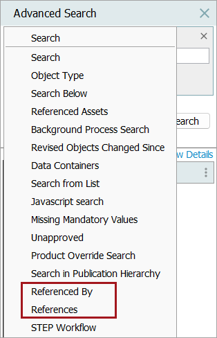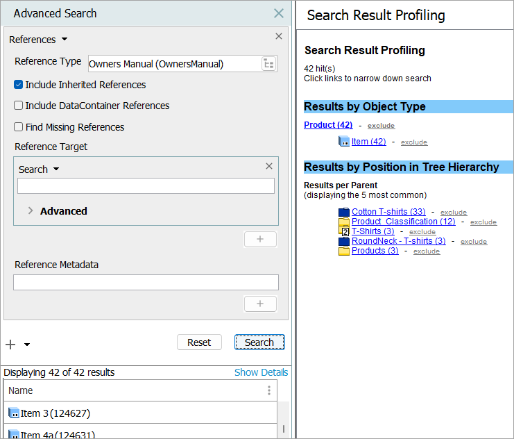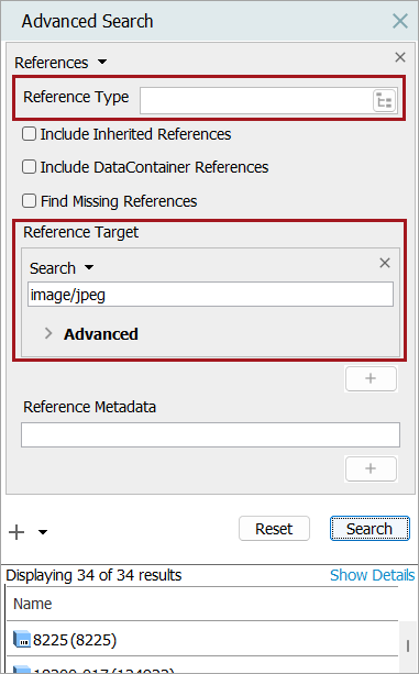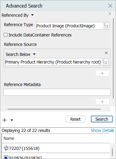 Both options require a reference type selection to begin. Reference types are setup in STEP Workbench System Setup tab in the Reference Types folder, and the Web UI Advanced Search allows you to pick from image and document reference types, classification reference types, and product reference types.
