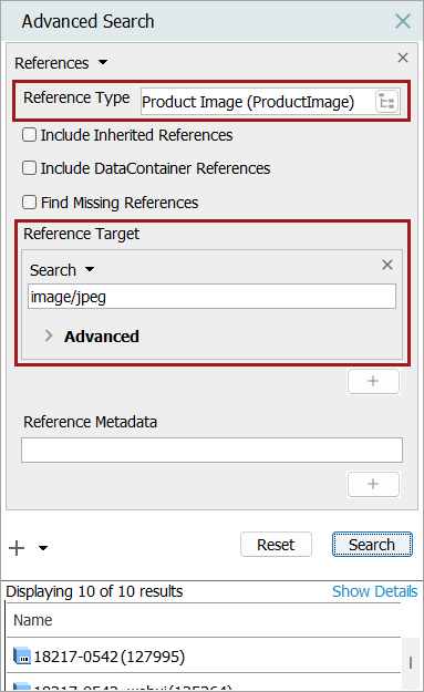 Values for metadata attributes may be searched by using the References or Referenced By search options. Users may indicate any value to search all metadata attributes for a matching value. Although the following pictures demonstrate with References, the same is true for Referenced By.