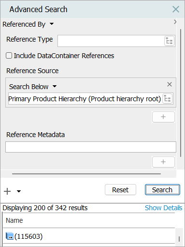 Once a reference type is entered, no additional options need to be filled in to start a search. Use the information at a high level or fill in the other values to drill down further (e.g., multi-supplier item references). Select a reference source under Referenced By and a target under the References. Plus enter specific attributes and values to search reference metadata.