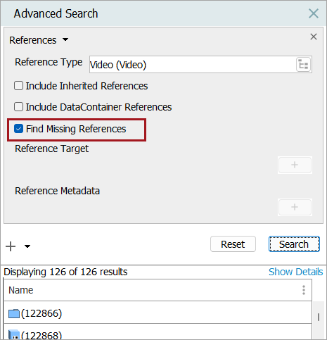Finding Missing References: When the reference type is selected, and this box is checked, the populated results will show all items that have that particular missing reference.