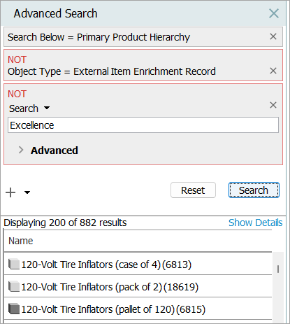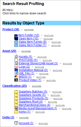 For all types of searches, the Search Result Profiling panel displays the results sorted by object type. The screenshot above shows the Results by Object Type. The search result includes Products, Assets, Classifications and Entities.