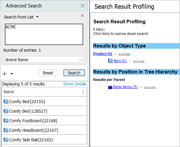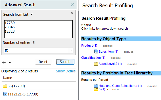 • Inherited attribute values (hierarchical inheritance) can be specified in the data list. The result set includes the object that contains the searched value as a local value. While this object may not match an object type restriction, it points to the origination of the searched text.