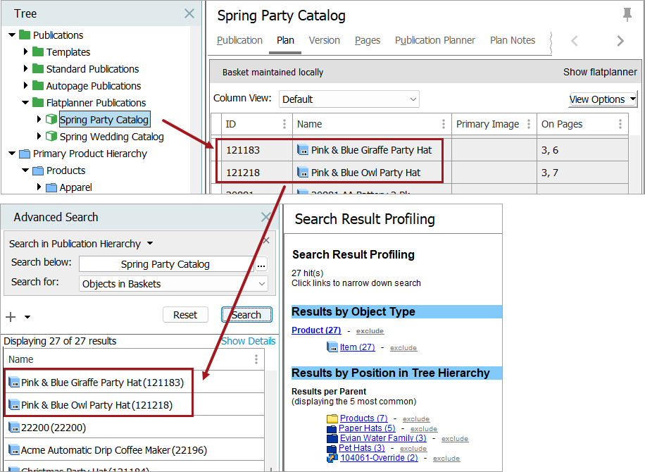 Objects linked to Publication / Section: When this option is selected, products and assets linked to a publication will be displayed in the result.