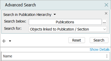 Note: To use 'Search in Publication Hierarchy' in the Advanced Search tab, it is recommended to have prior knowledge of Print Publisher and the publication hierarchy. For more information, refer to the Publication Hierarchy topic of the Publisher (Adobe InDesign Integration) documentation.
