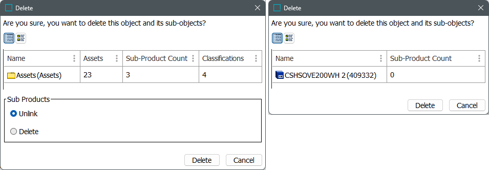 Sub Products - when deleting a classification, select Unlink to leave the sub product in the hierarchy, or select Delete to delete the selected objects and the sub products linked to the classification.