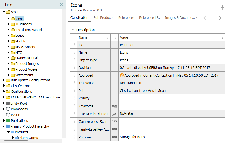 Note: Any number of attributes may be added to objects under the Description section. However, not all data shown in the Description section is an editable attribute. Fields such as ID, Revision, Approved, Translation, and Path are aspects of the object (not attributes), and are not editable. Name and Object Type are also aspects of the object, though these may be edited.
