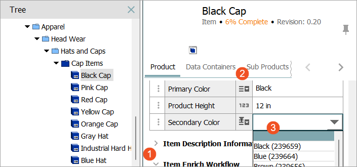 To edit data, click in any editable field. Text attributes can be edited by typing directly into the field, while LOV attributes will provide a dropdown from which users can select a value, as shown below (3).