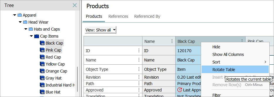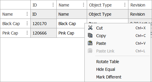 - Rotate Table: Used to rotate the data display. As a right-click option, it is only enabled from row / column headers when multiple objects are selected. For a single object, it can be used to rotate the data under a section only via keyboard shortcut (Alt + F11).
