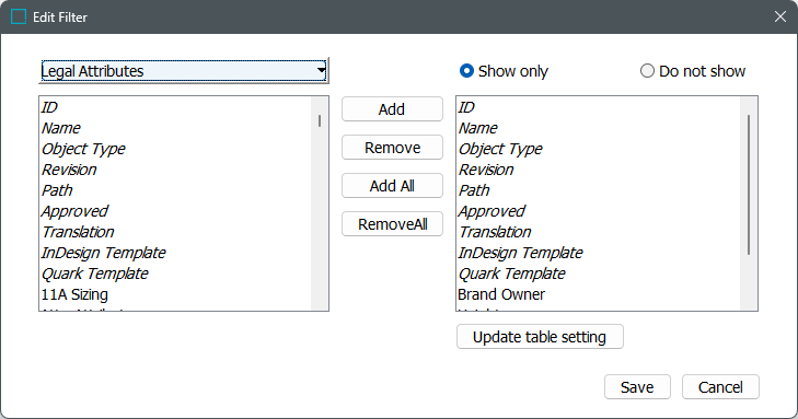 The dialog defaults to having only "legal" attributes shown, meaning those attributes that are valid for the object, as well as standard aspects of the object such as ID and Name. Note that object aspects are italicized, while attributes (which are always specification attributes) are shown in standard text. By default, all available attributes and aspects are shown in both the left and right panels. The dropdown in the upper left corner also has options to expose standard attribute search / browse functionality, though typically the Legal Attributes selection is used as this prevents a user from defining an invalid view. The 'Show only' and 'Do not show' radio buttons are applicable to the right panel, where the data for the view is defined. The Add button is used when an attribute or aspect has been selected in the left panel and should be added to the view (the right panel). The Remove button is used when an attribute or aspect has been selected in the right panel that should be removed the view. The Add All and Remove All buttons are used to add or remove all attributes and aspects from the view. Clicking Save stores the new view.