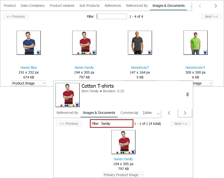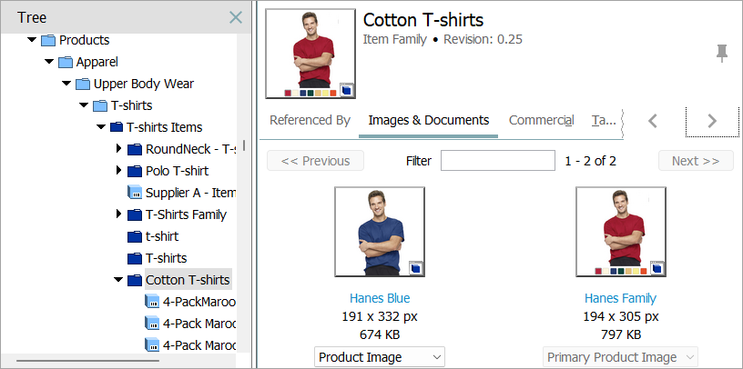 When working with products, the Images & Documents tab displays thumbnails of all assets that are referenced by the selected product, or inherited from a parental object referencing the asset. When working with classifications, this tab displays all assets that are child to the selected classification. The functionality for working with the displayed assets is the same, regardless of whether a product or classification has been selected.
