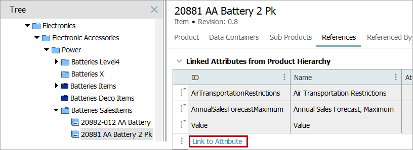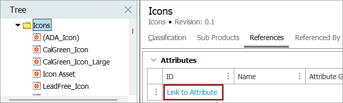 On the References tab of the object, expand the appropriate section (Linked Attributes from Product Hierarchy on product objects or Attributes on classification objects).