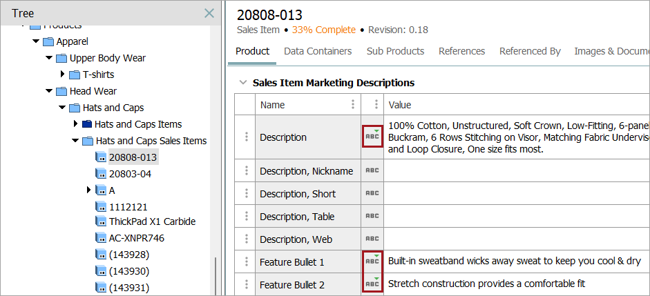 In addition to value inheritance, attribute inheritance is also available in the product hierarchy. This means that attributes can be linked to specific nodes / categories so they only appear for those categories and their children. For example, consider a company that manages data for both batteries and clothing. Size might be applicable to both categories of objects since both batteries and apparel have sizes assigned. However, sleeve length and voltage are characteristics applicable for clothing and batteries, respectively, and it could be confusing to have a 'Voltage' attribute on a clothing item. To avoid this, the 'Voltage' attribute could be linked to the 'Batteries' category, while the 'Sleeve Length' attribute could be linked to an 'Upper Body Apparel' category.