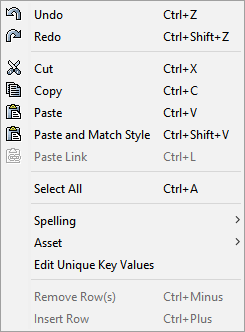 The Edit menu allows for typical text editing actions, asset editing actions, unique key editing, and spell check.