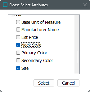 The Find Similar Product option populates a search based on the attributes and its values of the selected product. When this option is selected, a window will appear prompting the user to check off common attributes to search for.