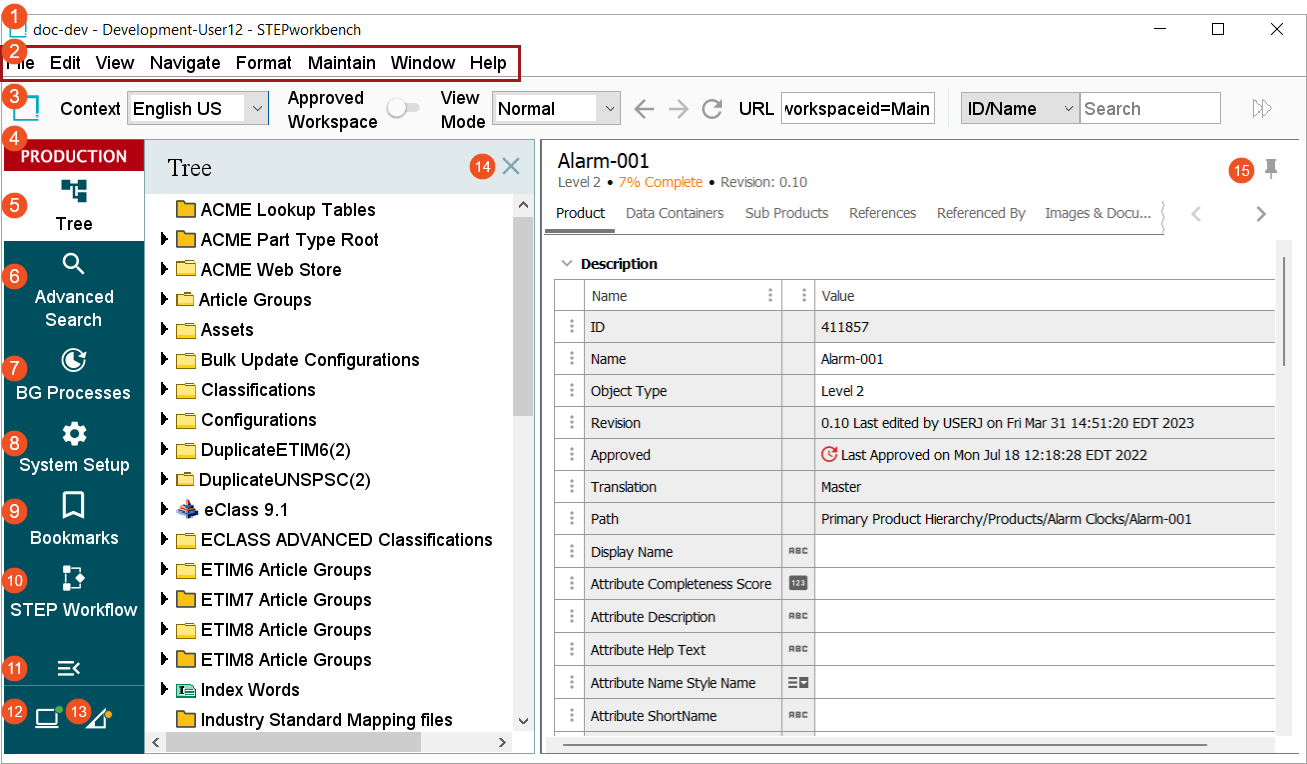 The screenshot below shows a basic view of the STEP Workbench. Though system customizations and variable access permissions may result in a slightly different view, the basic elements in this view of the workbench's Main Window will be present for most users. The key elements of the workbench UI are numbered and defined below.