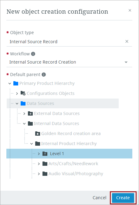 Enter an object type, a workflow, select the default parent node, and click the Create button.