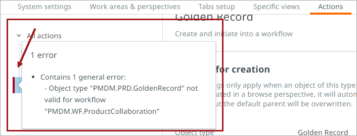 Note: Changes made to the properties of the actions may result in the action configuration to become invalid. If this happens, a red-line error indicator will display to the left of the affected configuration element. Hovering the cursor over the red line prompts an information pop-up to display. The pop-up describes the issue causing the configured element to be misconfigured, (as shown in the screenshot below), giving the user the information needed to make the appropriate change.