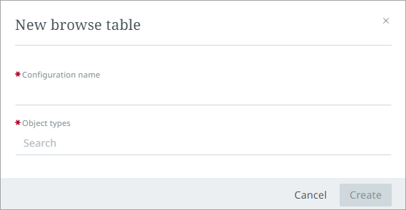 Click the '+' in the upper right corner of the page. A 'New Browse Table' dialog will display. Name the configuration and select one or more object types.
