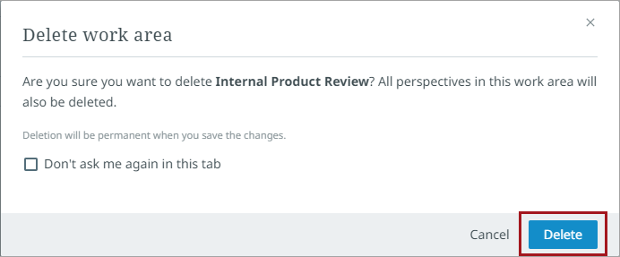 3. A dialog will display to confirm if the user wants to delete the work area. The dialog has an optional selection box that states 'Don't ask me again in this tab.' When checked, the 'Delete tab' warning dialog will not display again, and the remove button will immediately delete the selected tab when the '-' button is selected.