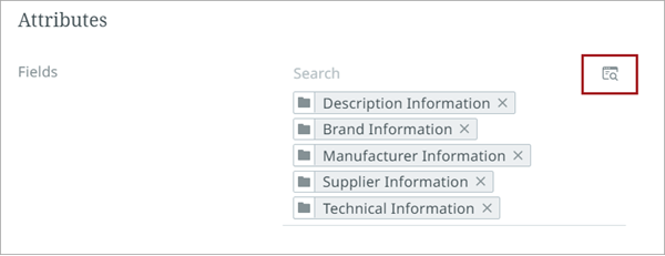 The 'Attribute groups' component allows admin users to select which attribute or reference fields should display in the tab. The search option utilizes a typeahead component with an option to open the Item Picker.