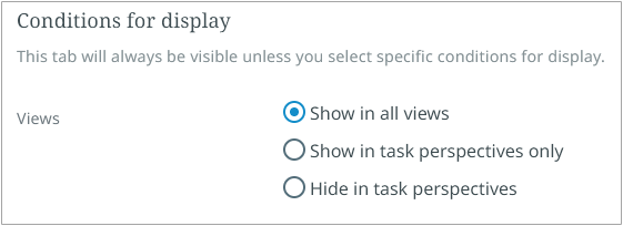 Views. The 'Views' parameter presents three radio buttons that, when set, determine which perspectives the tab will display in. This setting can help avoid cluttered interfaces by limiting the display of tabs to just those relevant to the user / user group.