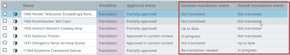 Once changes have been saved, tables in the applicable Tasks and Browse perspectives will display the target language translation status column(s) with the corresponding translation status for each product displayed: