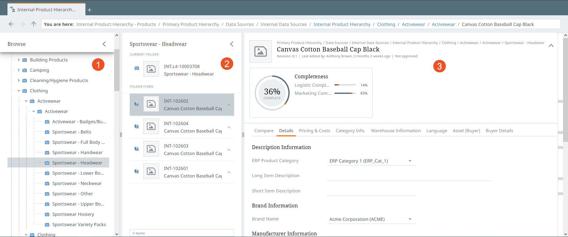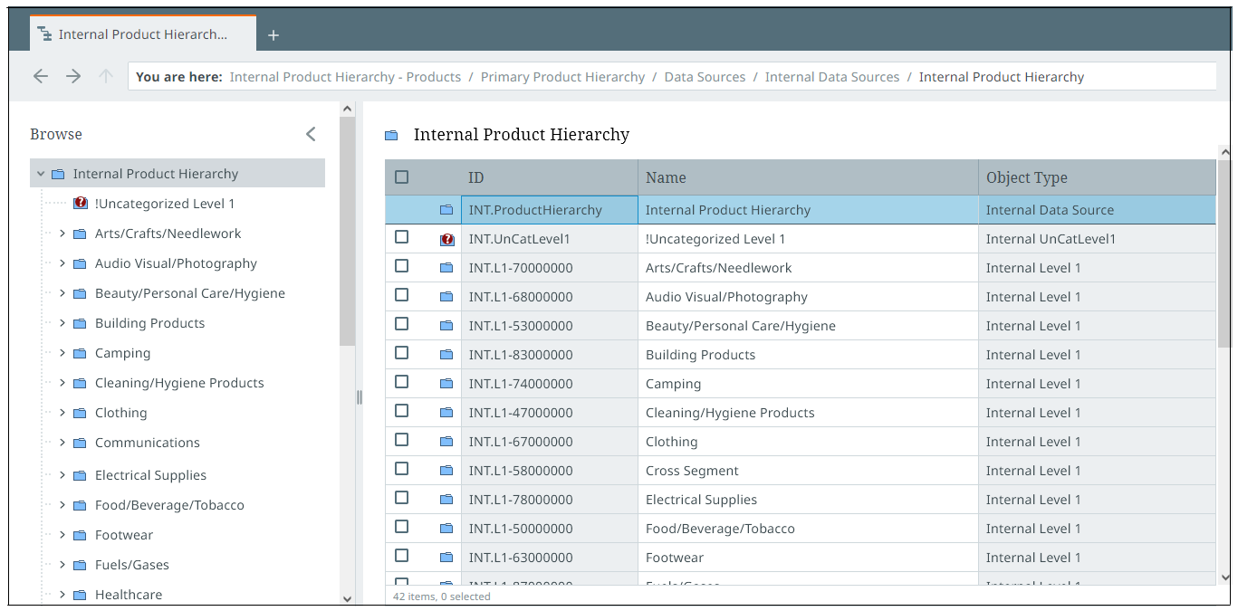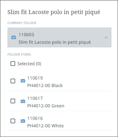 The 'Current Folder' navigation card displays the node you currently have selected in the navigation tree and the 'Folder Items' section below lists out all of the child objects. In the example image below, the current folder is a classification and the folder items are its linked products.