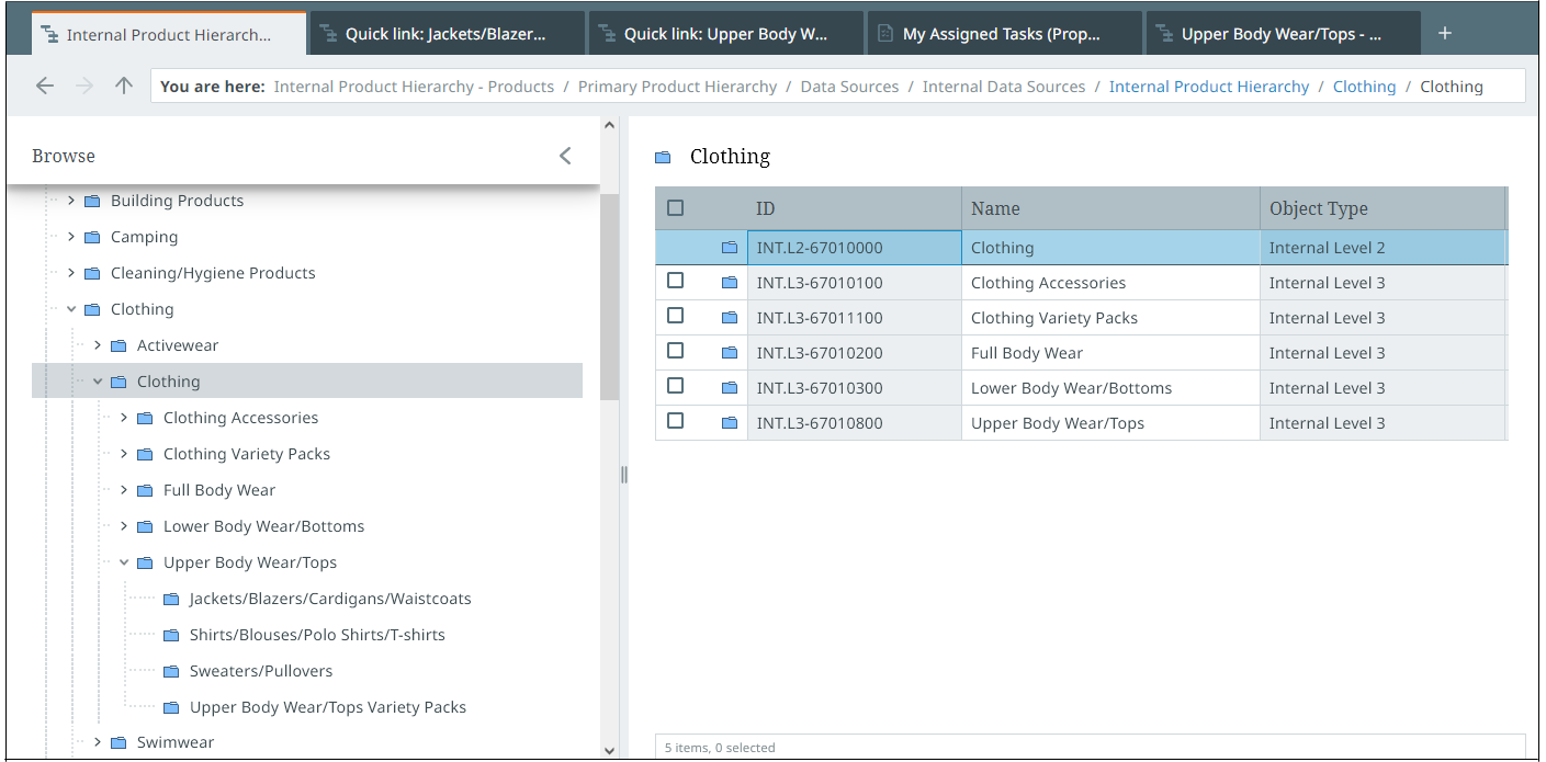 Note: When navigating a Classification hierarchy any linked objects will not appear in the tree. Instead, linked objects can be viewed via the node list that populates when selecting a classification in the details view or in a table when using the list view.