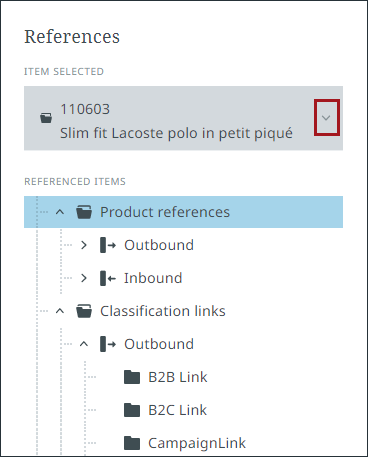 Clicking the arrow beside an object in the list will display all of its inbound and outbound references, as well as any classification links. Refer to Product References and Classification Links for more information.