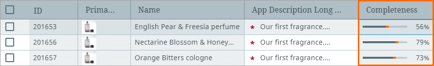 Once the Completeness column is added, the completeness score (based on the default metric) for individual products can be viewed in the list view.