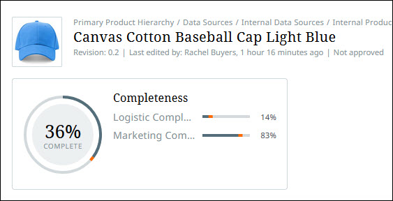 Completeness is a measure of how well a given product has been enriched with product data and is signified via a pre-configured score. Often, this score is determined by how many important attributes have been enriched with values. The Completeness tile displays data quality based on a percentage score. The percentage score itself is determined by metrics that check the attribute values of a specific product.