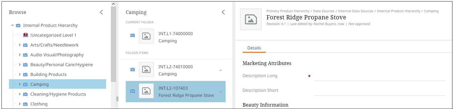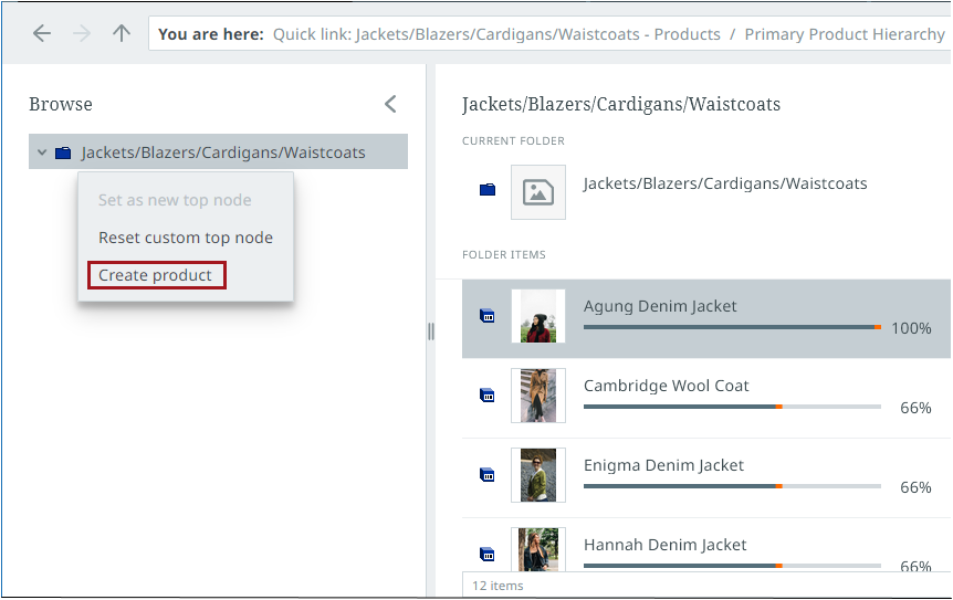 Where in the hierarchy the product, entity, or classification is created is derived from the currently selected location in the Browse perspective. Right-click on the Browse perspective menu at the point where you want to add the object.