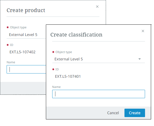 The 'Create product,' 'Create Entity,' or the 'Create classification' dialog appears, depending on the type of new object you are creating: