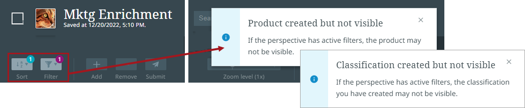 If the newly created object cannot be viewed in the current perspective, then a notification displays. For example, if the Browse perspective data set is filtered and the filtering is not applicable to the new product or classification, the screen will not automatically navigate to the new object but will provide information on why a detailed view cannot be shown.