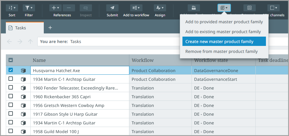 Create new master product family - This action creates a new master product family and automatically adds the product(s) you have selected to it.