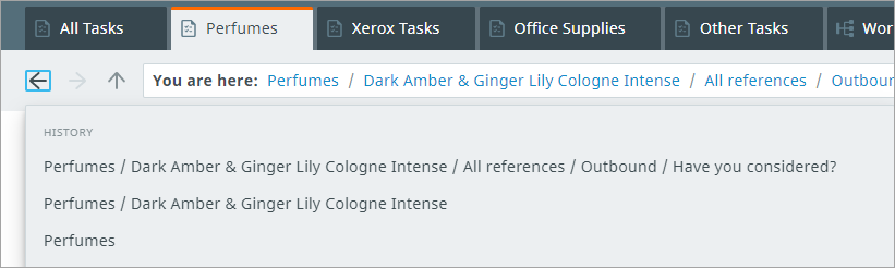 For easy navigation, the breadcrumb bar shows you breadcrumbs of where you are within a Tasks perspective. References are also reflected in the breadcrumb, if applicable.