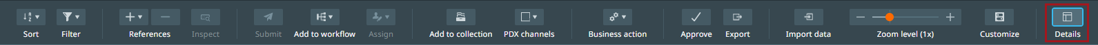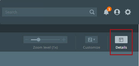 The details view focuses on the details of a specific item. The details view can be accessed by clicking the 'Details' button found in the toolbar near the right-hand side of the screen.