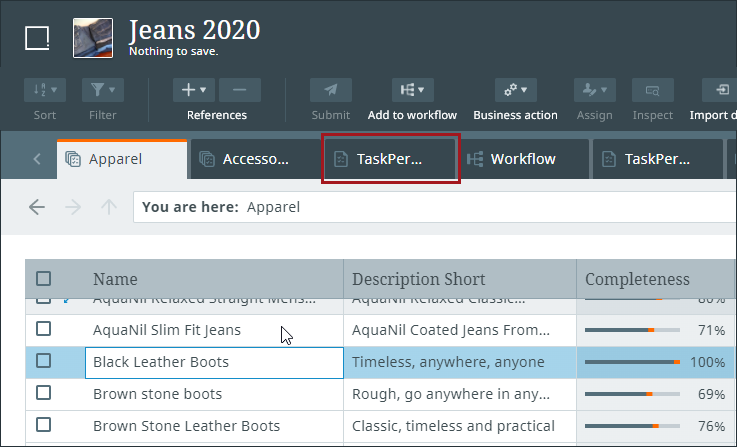 In the 'Tasks' perspective, for example, the 'Details' view shows the details of an item contained in a workflow, thus representing a workflow task. Details for an item in this perspective (shown below) are presented to the user in configurable tabs that can display referenced images and other assets, attributes, attributes groups, languages, and more.