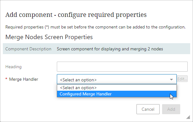 In the 'Merge Nodes Screen Properties' dialog, from the 'Merge Handler' dropdown select 'Configured Merge Handler' and click the Add button.