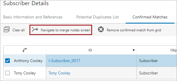 Note: Although the Merge Nodes Screen can be used to merge any nodes of the same super type, it is intended for use with matching algorithms and the Match Action for Identify Duplicates in conjunction with the Merge Confirmed Match From Grid action in the Confirmed Matches component.