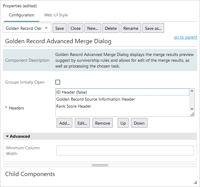 Additionally, by default, the following headers are pre-configured on newly created Advanced Merge Dialog components: ID, Golden Record Source Information, and Rank Score.