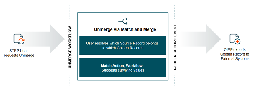 Even in the best organizations, accidents happen. When two records are merged accidentally, STEP has tools to help resolve the issue. In a data hub that is closely integrated with a multitude of source systems, the process of unmerge may require a range of activities in the workflow in addition to the actual unmerge Web UI. The Web UI unmerge uses both original source records from source systems, revision history, and the match algorithm survivorship rules to help the user determine which values belong to which records during an unmerge.