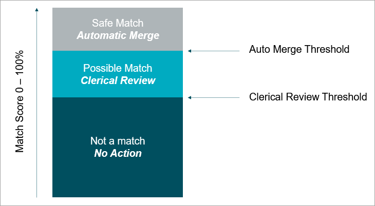 • A match score between the clerical review threshold and the auto threshold indicates a possible match. The two records are sent to the clerical review workflow so a user can determine if there is a match or not. The data steward manually confirms the two records are duplicates and merges them or confirms they are not duplicates and should be kept separate going forward.