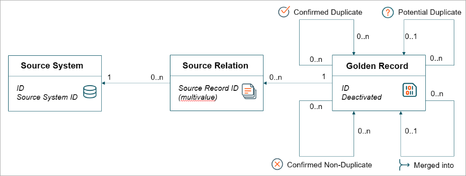 Unlike the Match and Link Match Action, in the Match and Merge Match Action the source record and golden record do not use separate object types. The source system is registered as an entity and the source relation is modeled as a reference from the golden record to that source system.