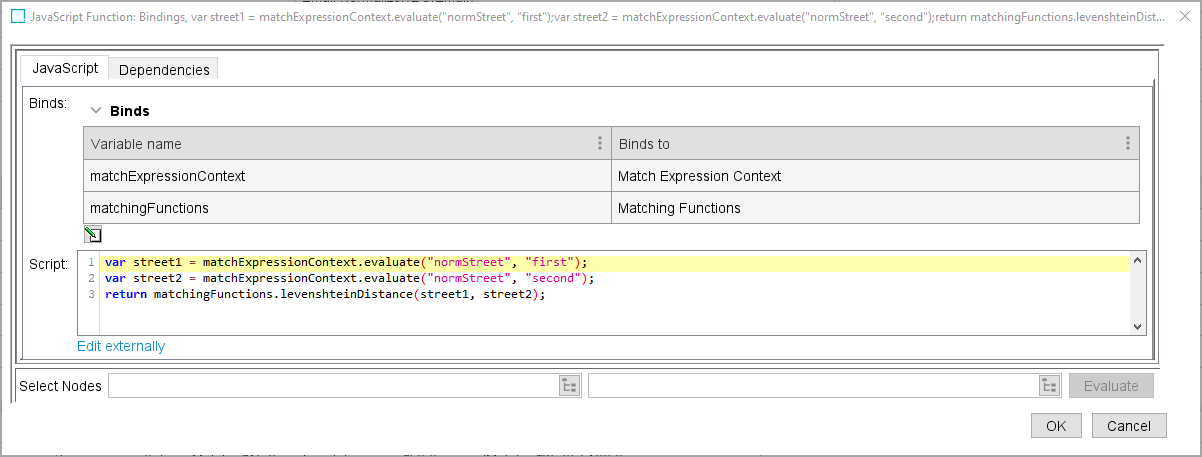 The example below uses the built-in levenshteinDistance function to get the edit distance between normalized street values. 'Matching Functions' is bound to 'matchingFunctions.'