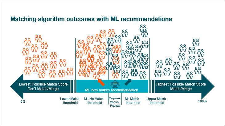 During clerical review for a match and merge solution, a data steward could face thousands of records that must be either merged or rejected. The Machine Learning Match Recommendations (MLMR) ease the workload by providing recommendations for merging or rejecting based on the data steward's previous decisions. This functionality works entirely on the Clerical Review Task List and does not influence the matching algorithm. When using the recommendations combined with the filtering and merge / reject bulk update capabilities, the data steward can resolve the task list more rapidly.