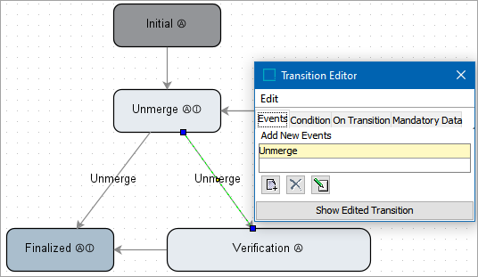 - If a transition out of the Unmerge state exists but is not valid for a completed unmerge operation, edit the valid transitions to add events named 'Unmerge' to ensure the expected data flow.
