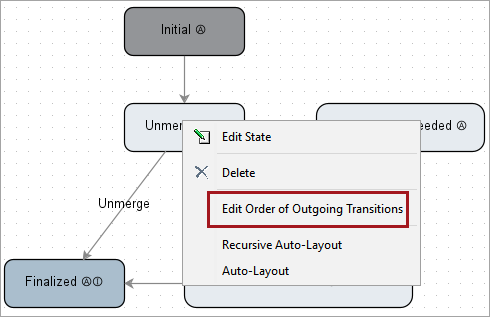 - If required, set the order that the transitions should be evaluated on the 'Unmerge' state. Right-click a state, select Edit Order of Outgoing Transitions and arrange the outgoing options.